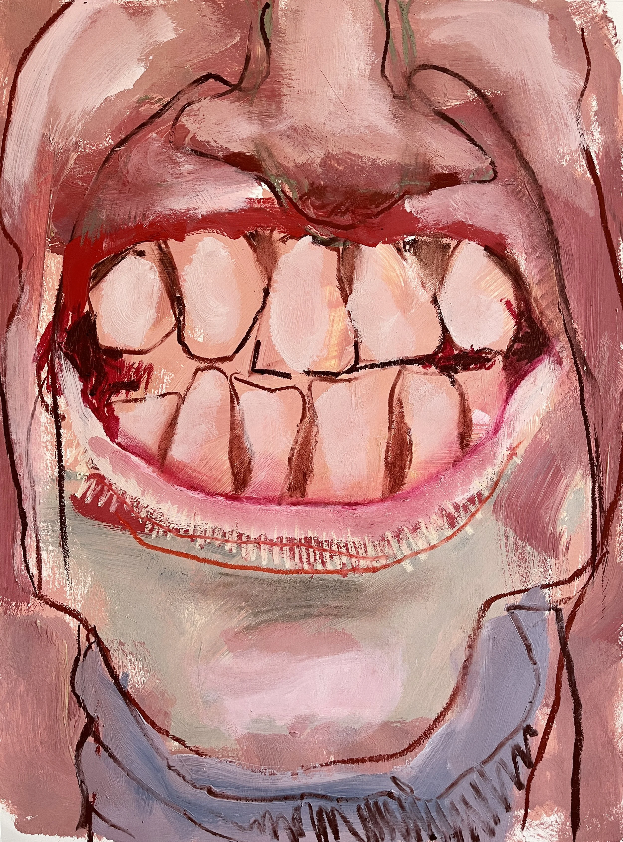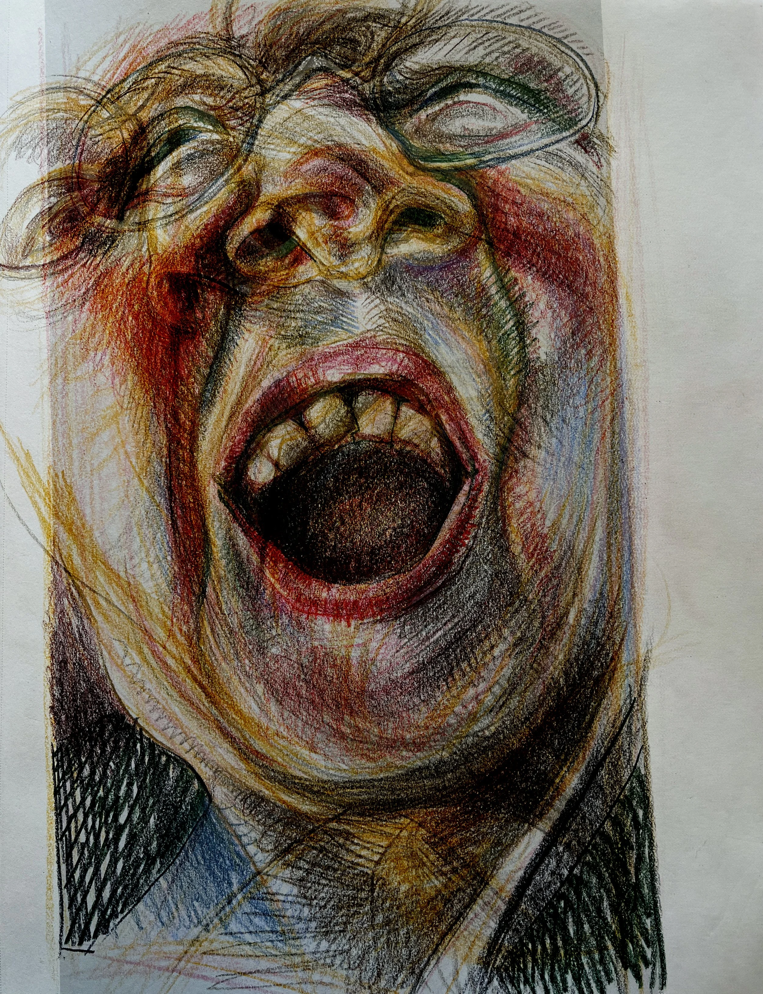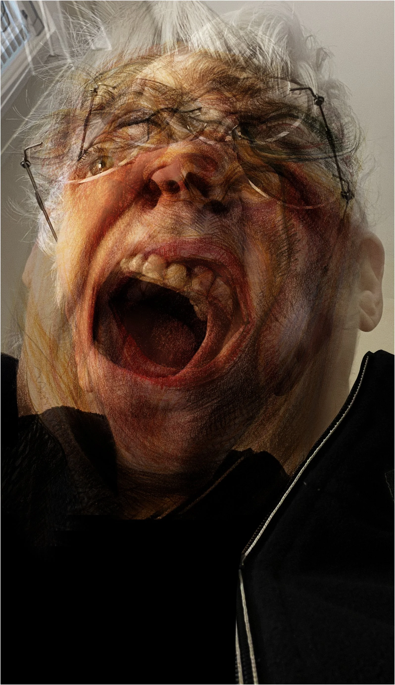 One day, I was working on a series of self-portraits to try to capture Ruthie-the-Rageful-caregiver. I took some selfies with different angry facial expressions, feeling a bit like an imposter acting out the feelings. The photographs were disturbing to look at, but still too tame. They didn’t show quite how it really felt from inside. I then made some drawings from the photographs and overlaid the drawings one of top of another in a digital imaging program on the computer. It began to feel right.